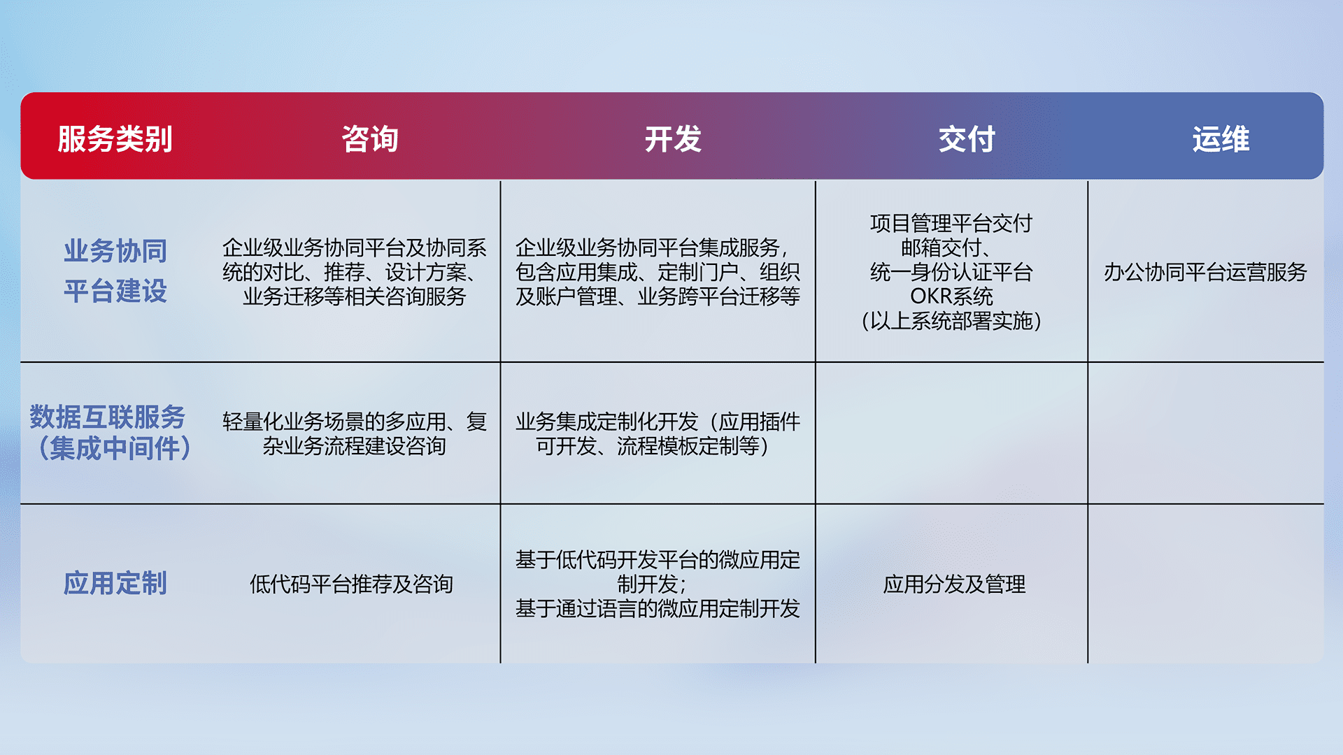 针对钉钉、、、、企微、、IDaas等平台级产品提供产品的规划、、方案、、、、交付、、定制化开发等服务,,实现如统一协同办公、、智能客户服务、、、、混合会议管理、、、、智能数据查询、、、等业务场景,,,实现数字化转型。。